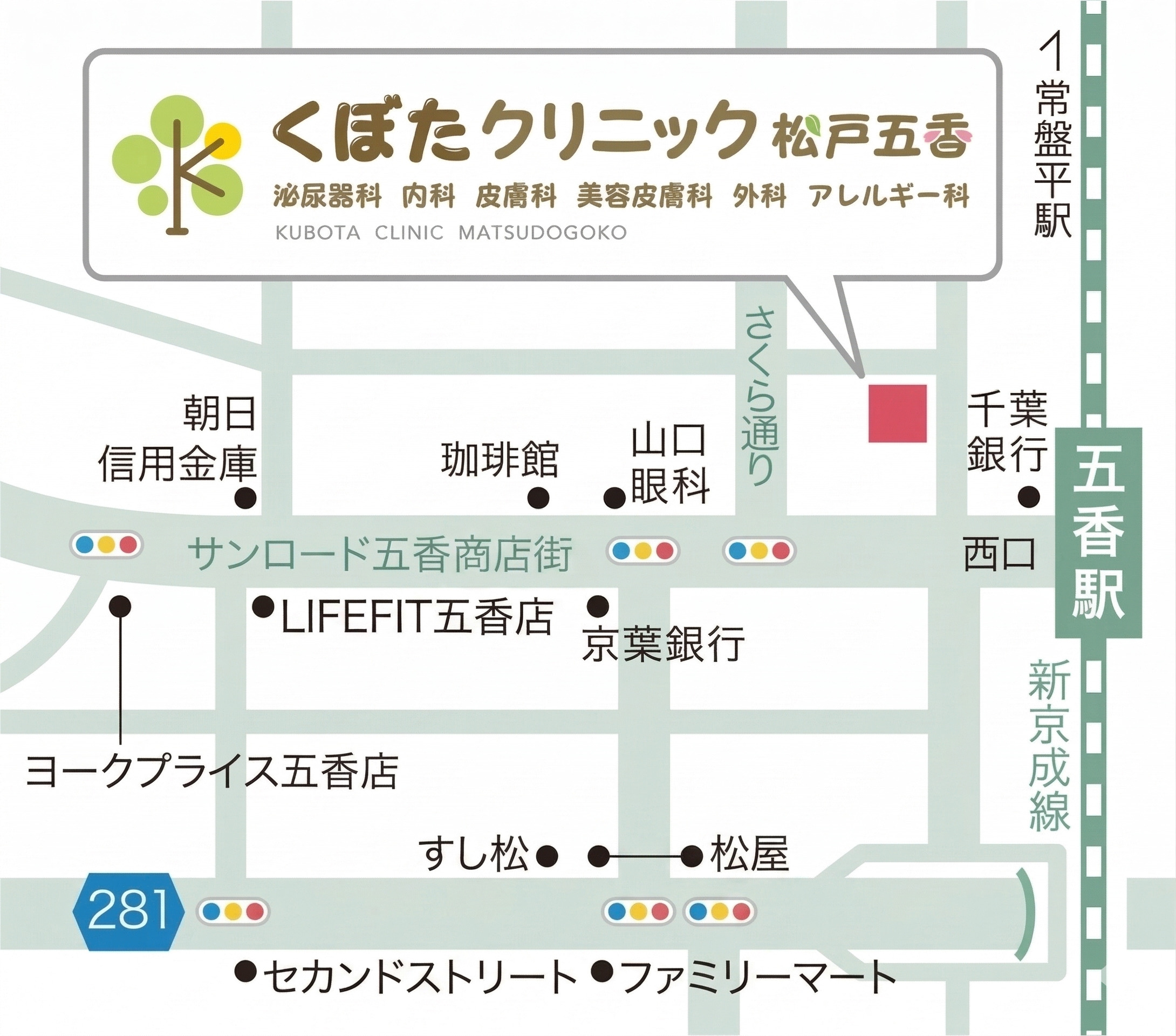 ①けやき薬局 ②鈴木薬局 ③そうごう薬局 ④五香薬局 ⑤マツモトキヨシ五香駅前 ⑥友愛薬局