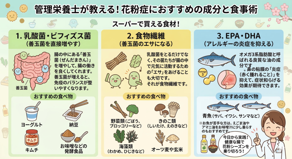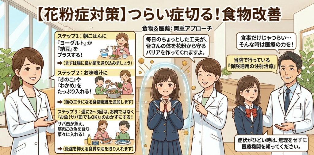 だからこそ、腸に直接届く**「食事」**が、花粉症対策として非常に重要になってきます。
