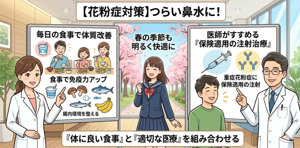 いかがでしたか? 花粉症は本当につらいですが、**「体に良い食事」「適切な医療」**を組み合わせることで、春の季節も明るく楽しく、快適に過ごすことができます。