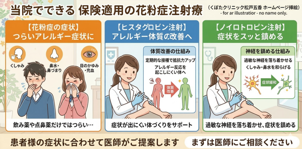 くぼたクリニック松戸五香では、飲み薬や点鼻薬に加えて、花粉症に対する注射治療も行っております。しかも、これらは**「保険適用(健康保険が使える)」**で行えます。