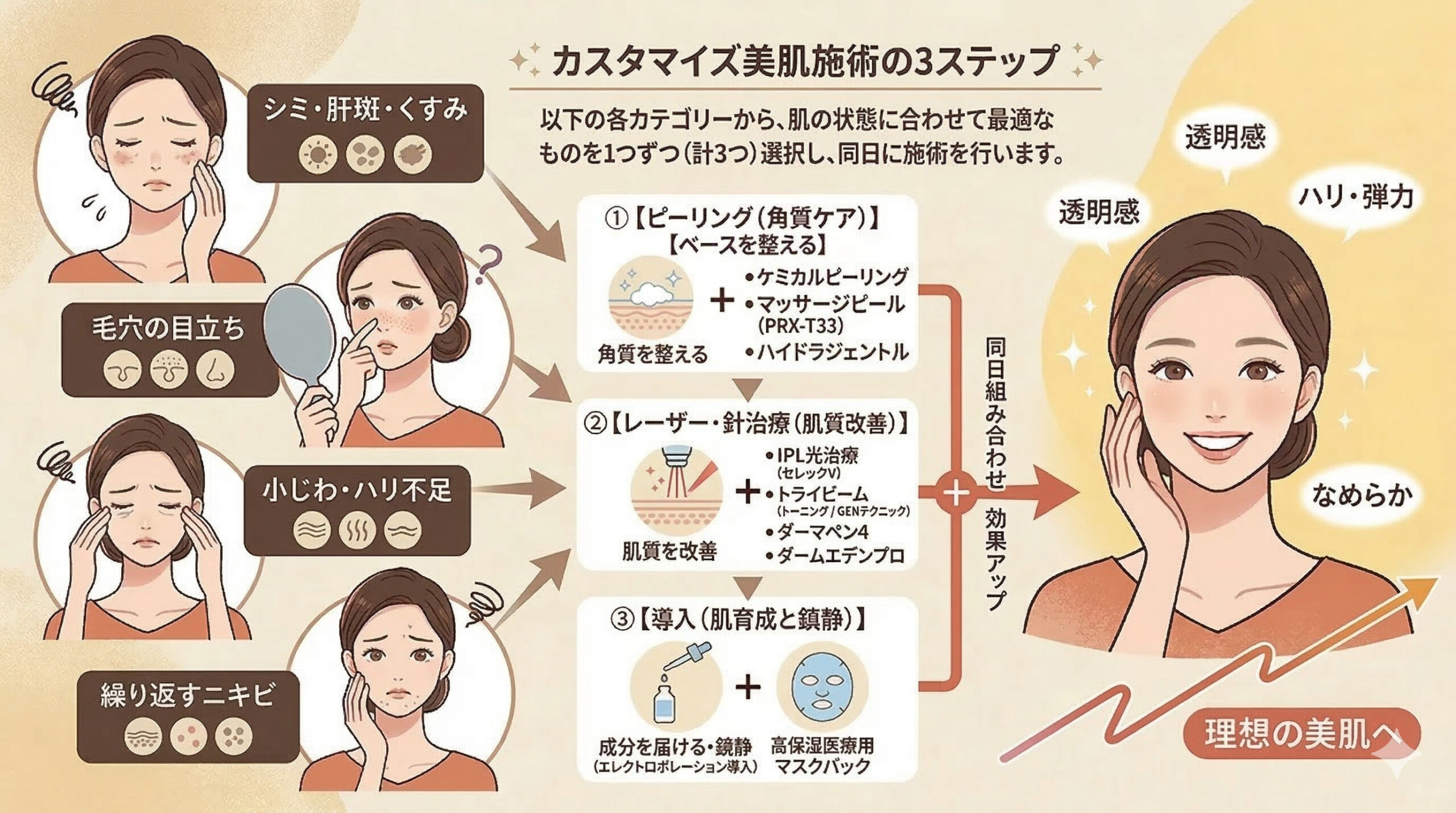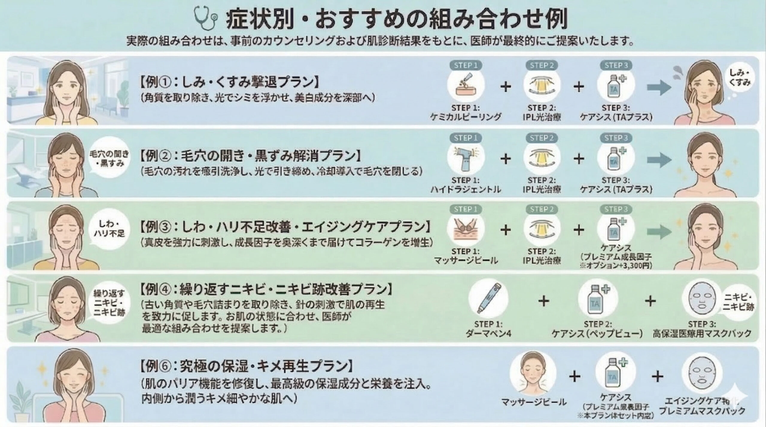 実際の組み合わせは、事前のカウンセリングおよび肌診断結果をもとに、医師が最終的にご提案いたします。