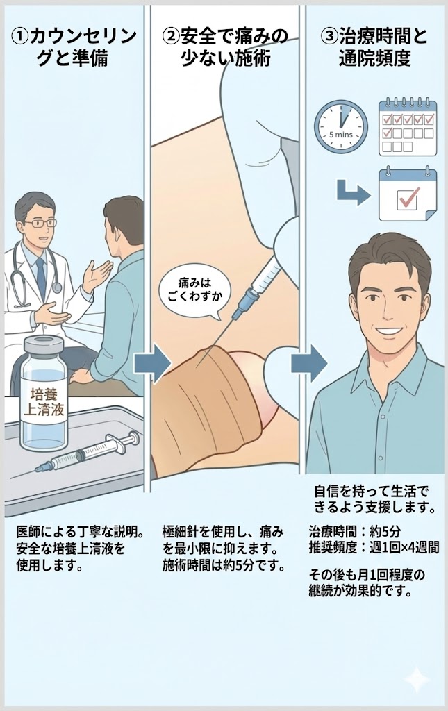 この治療法では、成長因子を陰茎の海綿体に直接注入し、血管の再生を促進します。これにより、EDの根本原因に対処し、一時的な解決ではない持続可能な改善を目指します。