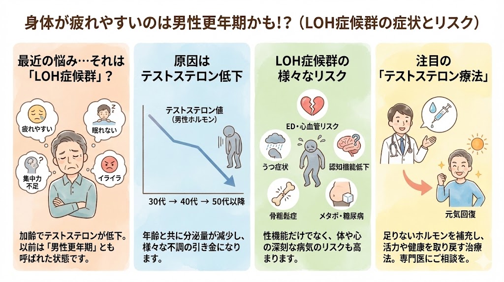 加齢よって男性ホルモンであるテストステロンが低下する症候群のことをLOH症候群(late onset hypogonadism)と言います。