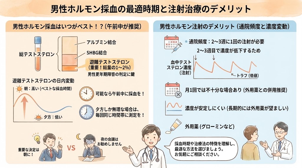 遊離テストステロンの値は日内変動があり朝高く夕方にかけて低くなるという特徴があります。