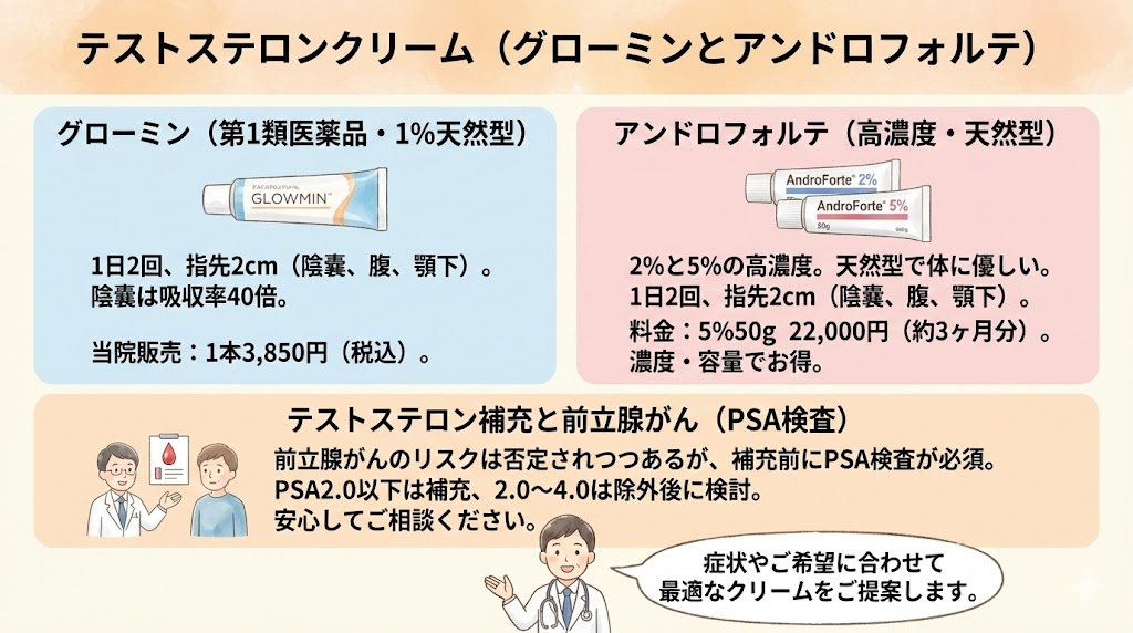 ですので安心してテストステロン補充(注射やクリーム)のご相談をいただければと思います。