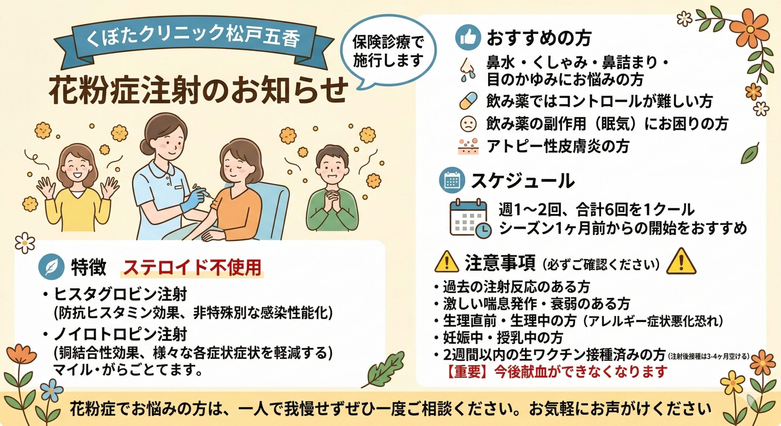 【保険適用】つらい花粉症に。ステロイド不使用の「花粉症注射」をはじめました