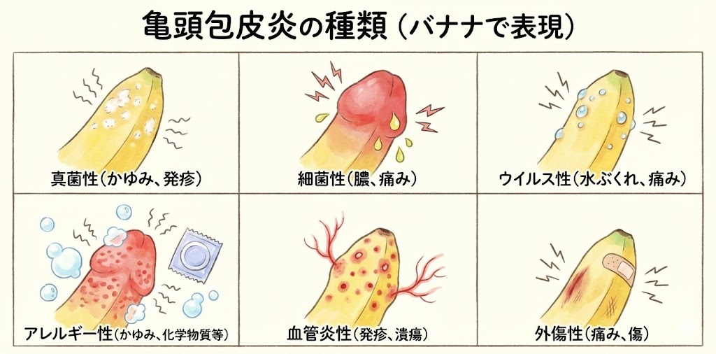 亀頭包皮炎にはいくつかの種類があります。以下に一般的な亀頭包皮炎の種類を示します。