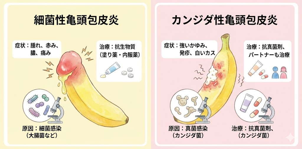 - 細菌性亀頭包皮炎:細菌感染によって引き起こされる炎症で、膿や痛みが特徴的で す。