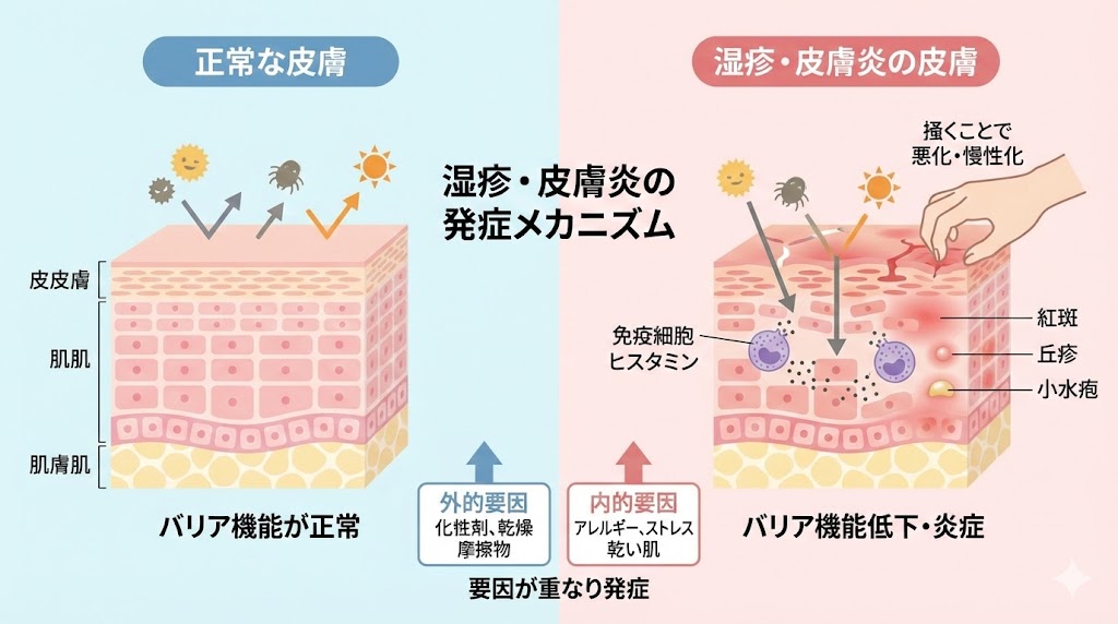 皮膚は、外部の刺激から体を守るバリアの役割を果たしています。しかし、何らかの理由でこのバリア機能が低下したり、強い刺激を受けたりすると、免疫細胞が反応して炎症(湿疹)が起こります。