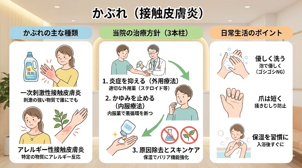 当院では、問診を通じて原因物質の特定に努め、可能な場合はパッチテストなどの検査も検討いたします。