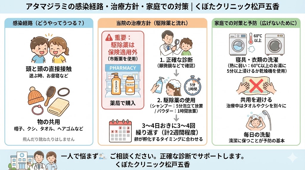 アタマジラミの治療薬(駆除剤)は、現在の日本の医療制度では「保険適用外」となっており、病院で処方箋を出すことができません。そのため、当院では診断を確定させた上で、薬局やドラッグストアで購入可能な市販の駆除薬(スミスリンシャンプーやパウダー)の使用方法をご指導させていただいております。