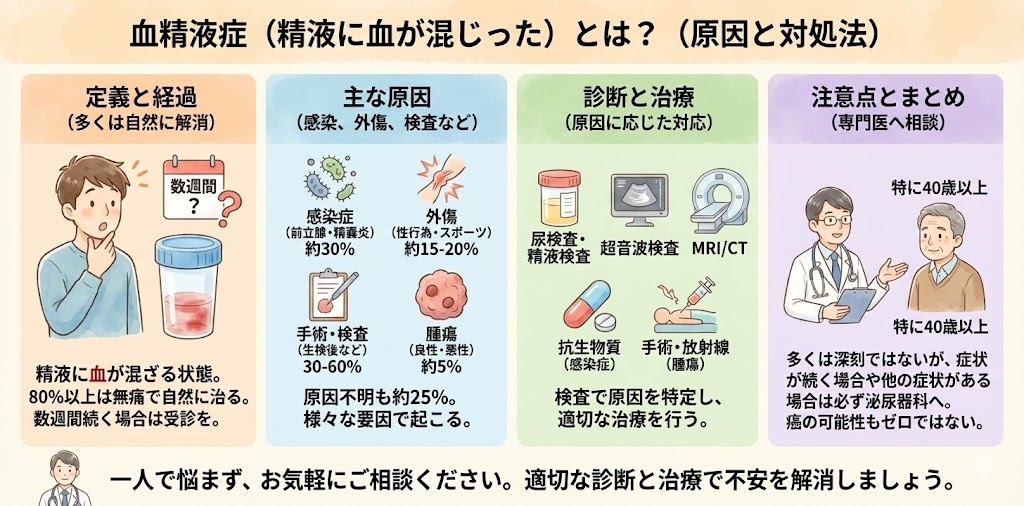 血精液症は、精液に血液が混ざる状態を指します。この症状は多くの場合無痛で、80%以上の症例が特に治療を要さず自然に解消されるとされています。しかし、症状が数週間以上続く場合や他の症状(例:痛み、排尿困難)が伴う場合は、医師の診察が必要です。