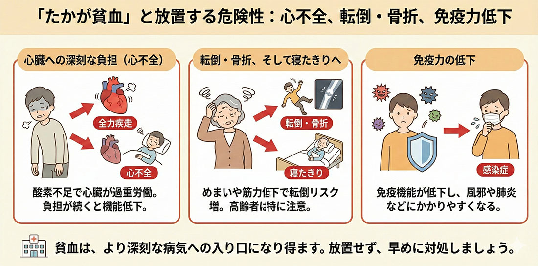 貧血を軽視し、適切な対処をせずに放置すると、体に様々な悪影響が及びます。特に中高年の方の貧血は、将来的な深刻なリスクに直結する可能性があります。