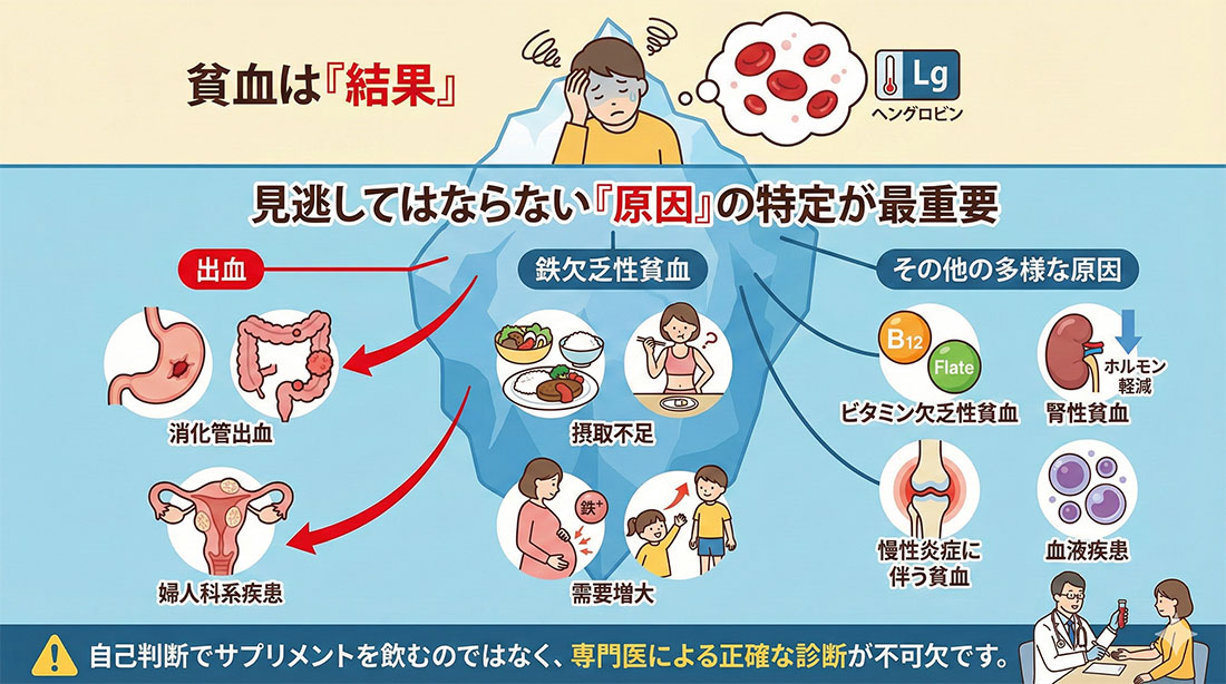 単に鉄剤を飲むだけでは、根本的な解決にならないばかりか、背景にある重大な病気を見逃すことにも繋がりかねません。貧血の原因は多岐にわたります。
