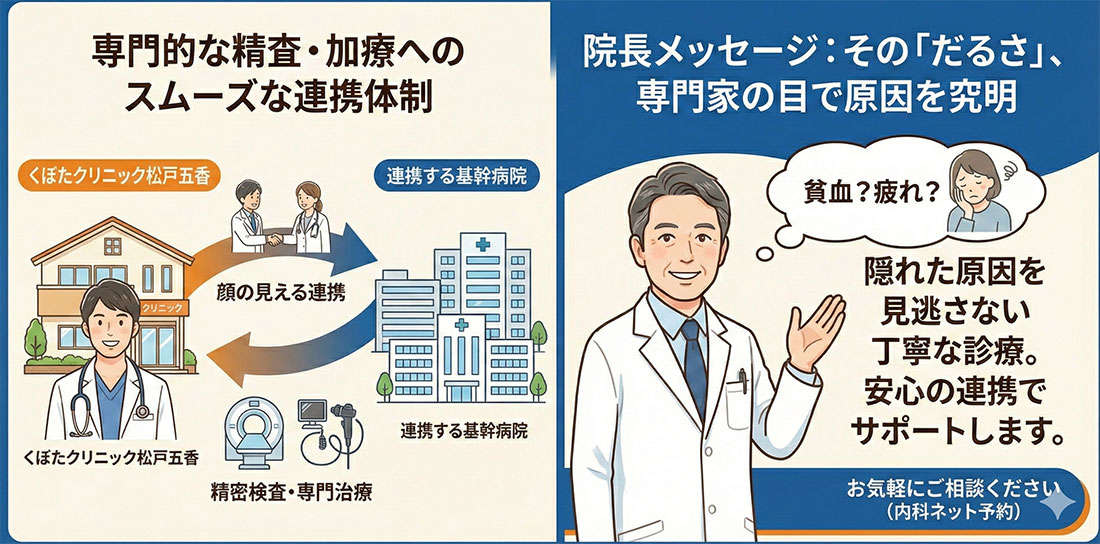 くぼたクリニック松戸五香の内科では、「立ちくらみ」や「動悸」「息切れ」「疲労感」といった貧血が疑われる症状から 、健康診断で貧血を指摘された方まで、専門的な診断と治療を行っています。「調子が悪いのだけれど、何科を受診したらいいのかわからない」といった曖昧な不調や健康上の不安についても 、最初の相談窓口としてお気軽にご相談ください。
