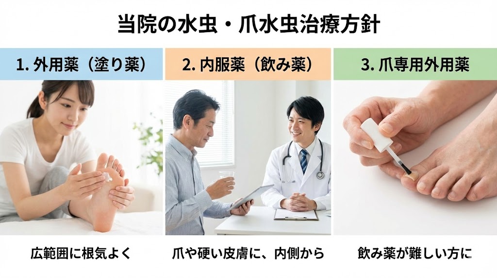 爪水虫や、足の裏の皮膚が硬くなって塗り薬が浸透しにくいタイプの水虫(角質増殖型)には、内服薬(抗真菌薬)の使用を推奨しています。