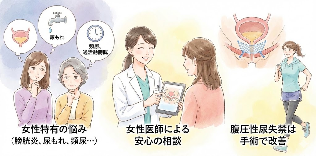 泌尿器科というと性病や前立腺肥大など、男性のための科だと思われていることがあります。しかし、前述した通り、女性も膀胱炎や過活動膀胱、腹圧性尿失禁など様々な病気があり、膀胱がんや腎臓がん、尿管がん、尿管結石といった病気も女性に起こり得ます。女性にとっても泌尿器科は非常に重要です。
