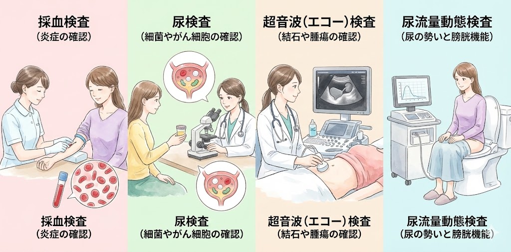 尿検査は、尿の中の赤血球、白血球、細菌、がん細胞の有無を調べます。尿失禁の原因が感染やがん(悪性腫瘍)などによる場合もあるので、確認します。
