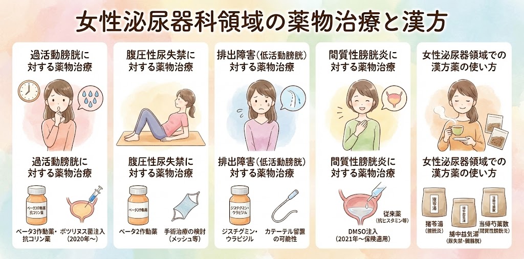 腹圧性尿失禁に対する薬物治療では、まずベータ2作動薬を使用します。これらの薬は、骨盤底筋を強化し、尿失禁の症状を軽減する効果があります。同時に体操や骨盤底筋トレーニングを行っていただくことで、より治療効果が上がります。