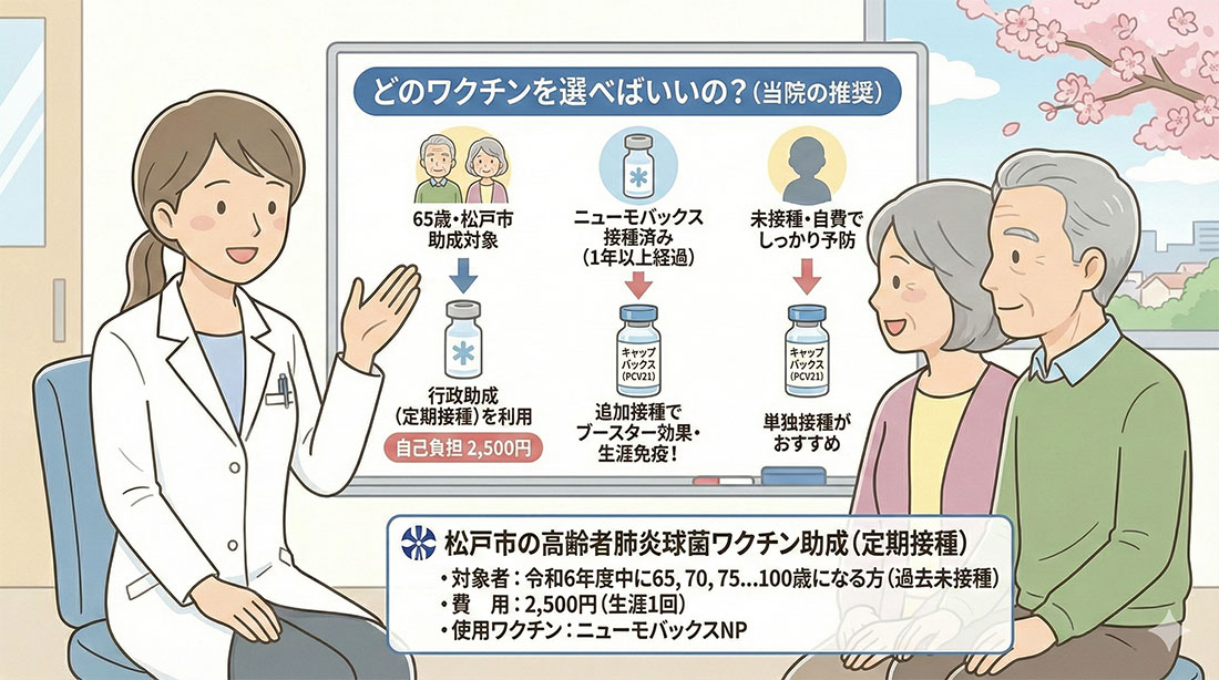 まずは行政の助成(定期接種)を利用して「ニューモバックス」を接種することを推奨します。自己負担2,500円で接種が可能です。