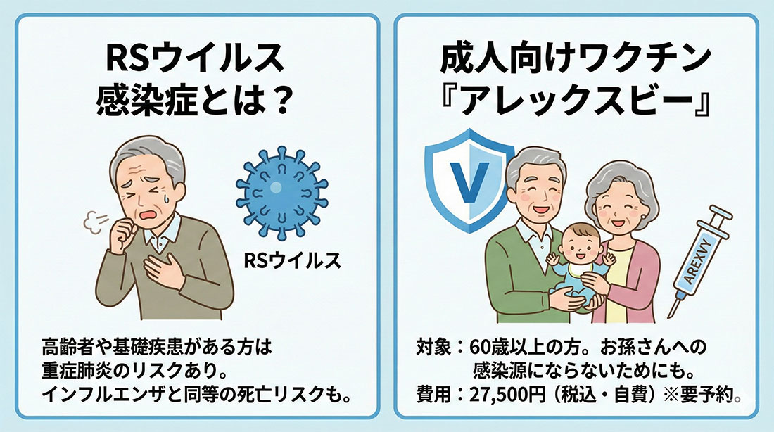これまで成人のRSウイルスにはワクチンがありませんでしたが、「アレックスビー」の登場により予防が可能になりました。