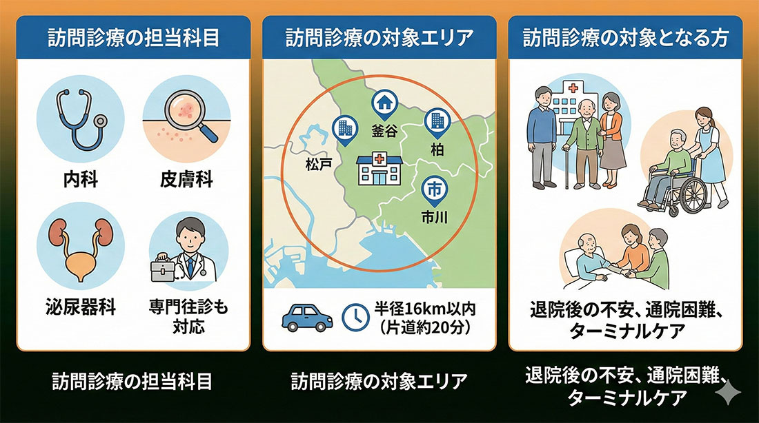 訪問診療が行えるエリアは、医療機関から半径16km以内の範囲となっています。 これは、移動時間でおおよそ片道20分の範囲内を基準としています。 緊急の往診が必要な場合にも、対応エリア内であれば迅速に医師がお伺いできるため、患者様には安心して診療を受けていただけます。訪問診療の対象となる方